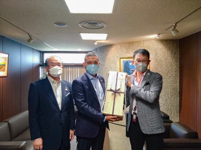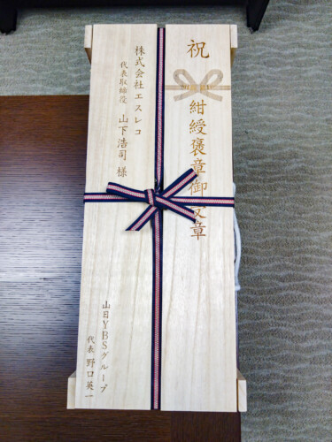 この度、弊社へ下賜されました紺綬褒章の伝達に際し、令和4年9月22日、山日YBSグループ代表 野口英一様、並びに、山日YBSグループ取締役相談役 中村一政様より、真田紐を箱紐として配した地元ワインの記念品を賜りました。